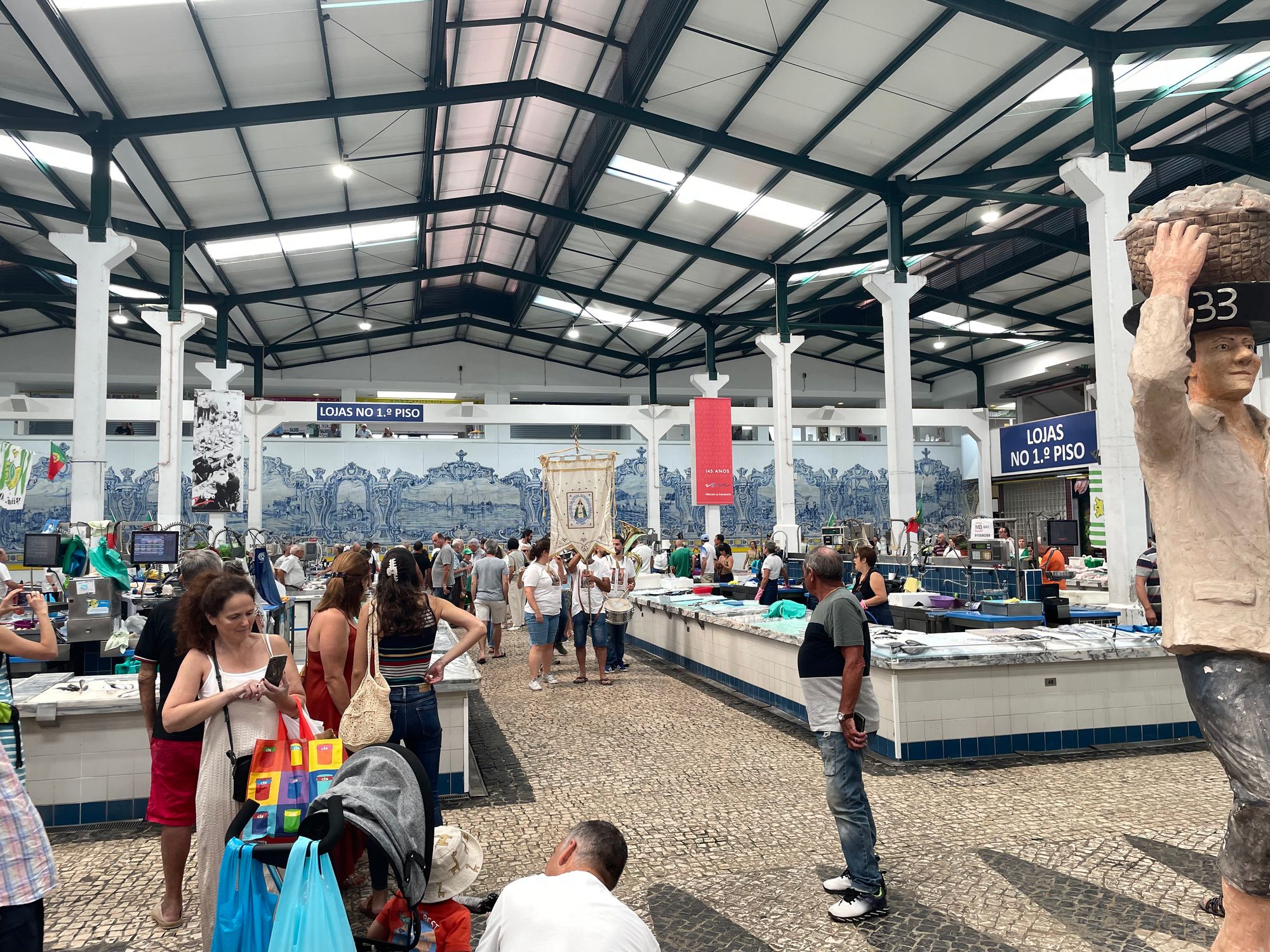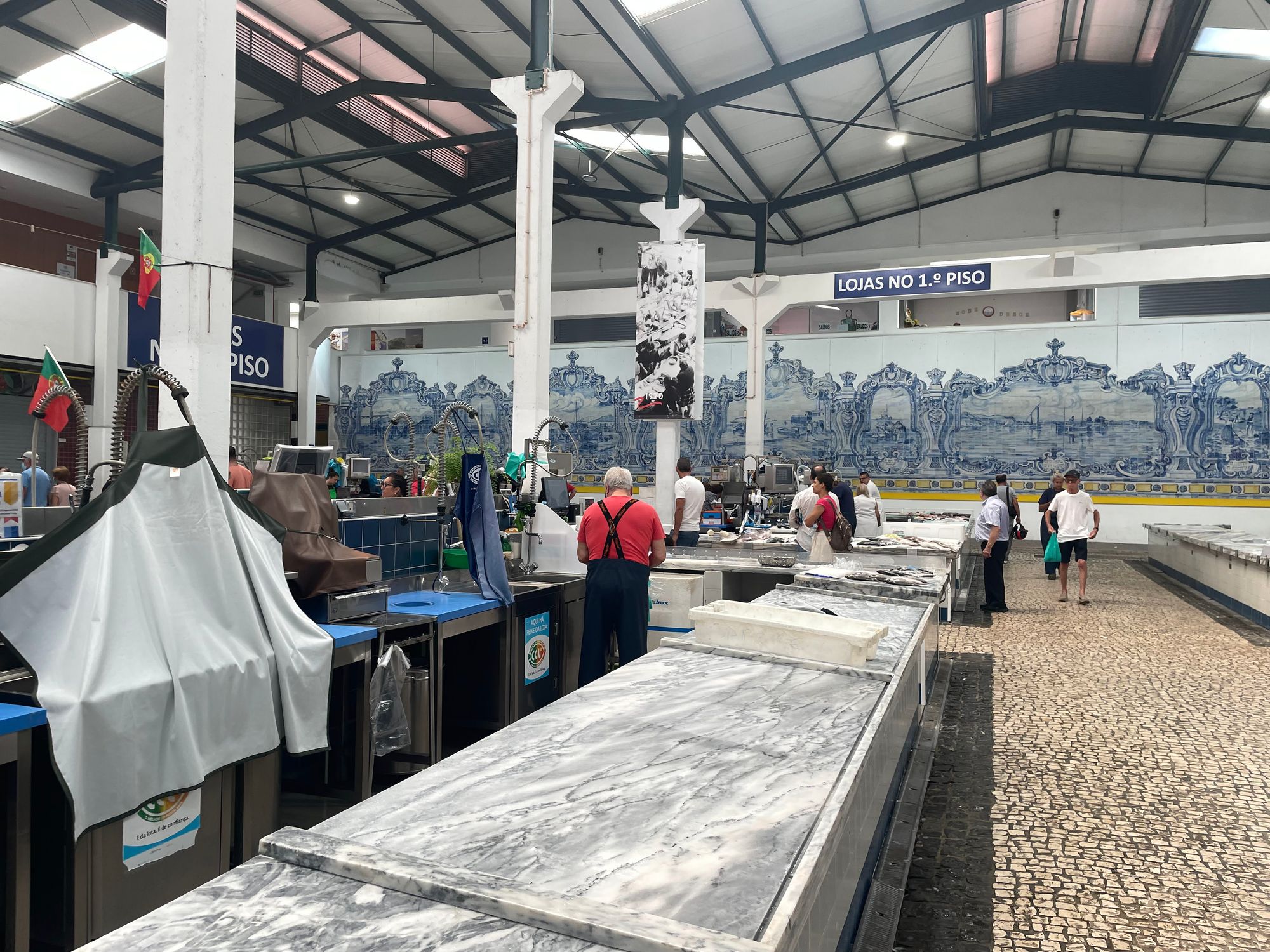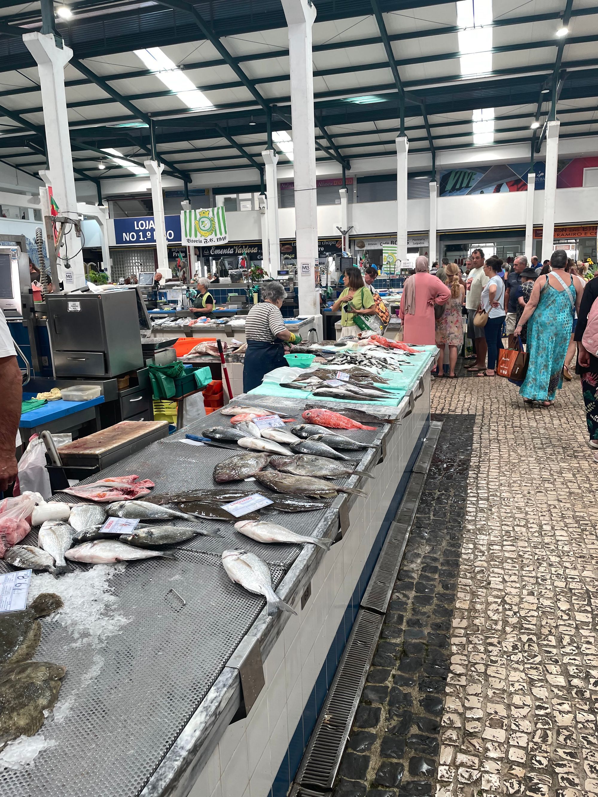 Setubal is renowned for its seafood. Grilled sardines and Choco Frito (fried cuttlefish) are available in many of the restaurants and fishing in general dominates the culture of the area. Additionally the Mercado do Livramento on the famous Av de Louisa Todi is reportedly the largest indoor market in the country and boasts some of the best seafood in the world. It's a 7ish minute walk from our apartment and does not disappoint. Here you will find tuna, salmon, sea bass, bacalhau, sardines, grouper, mackerel sword and scabbard fish, and many, many more varieties. There are also butcher shops, wine stores, cheese makers, farm produce stands, and olives, so many olives. This week Steve came home with potatoes, olives, cherries, and a bottle of piri-piri (hot sauce) made in central Portugal.
