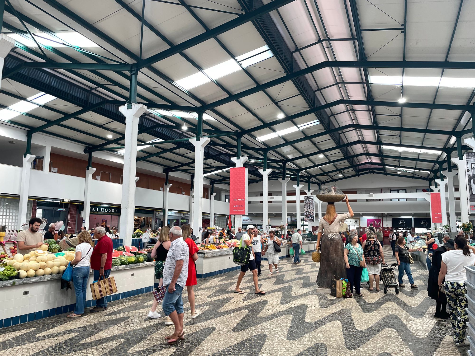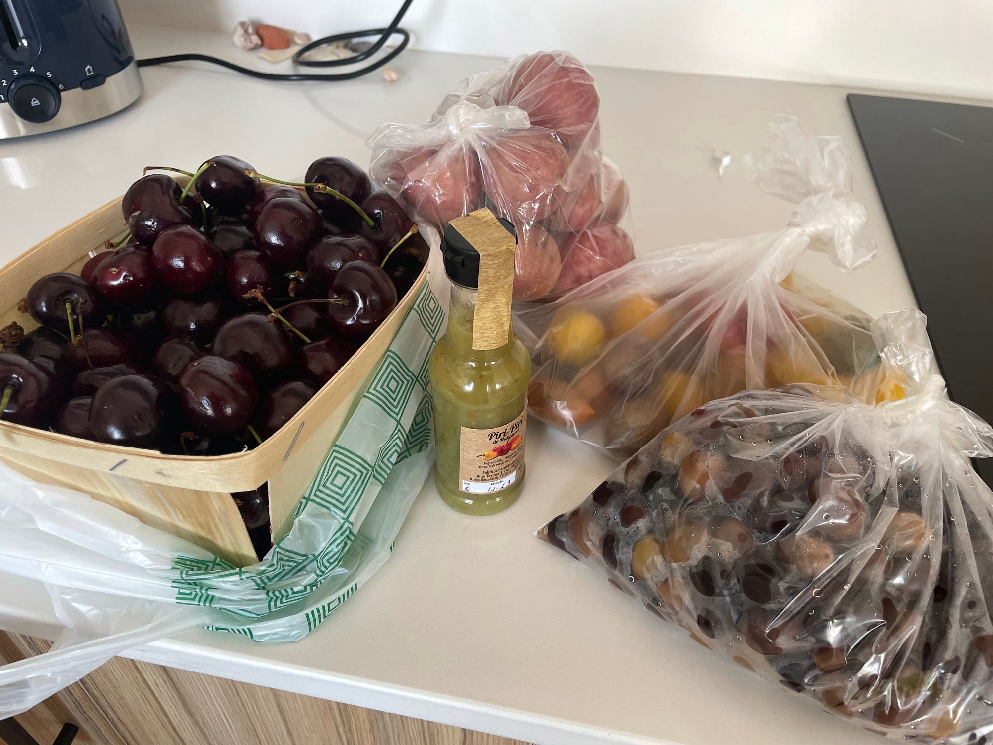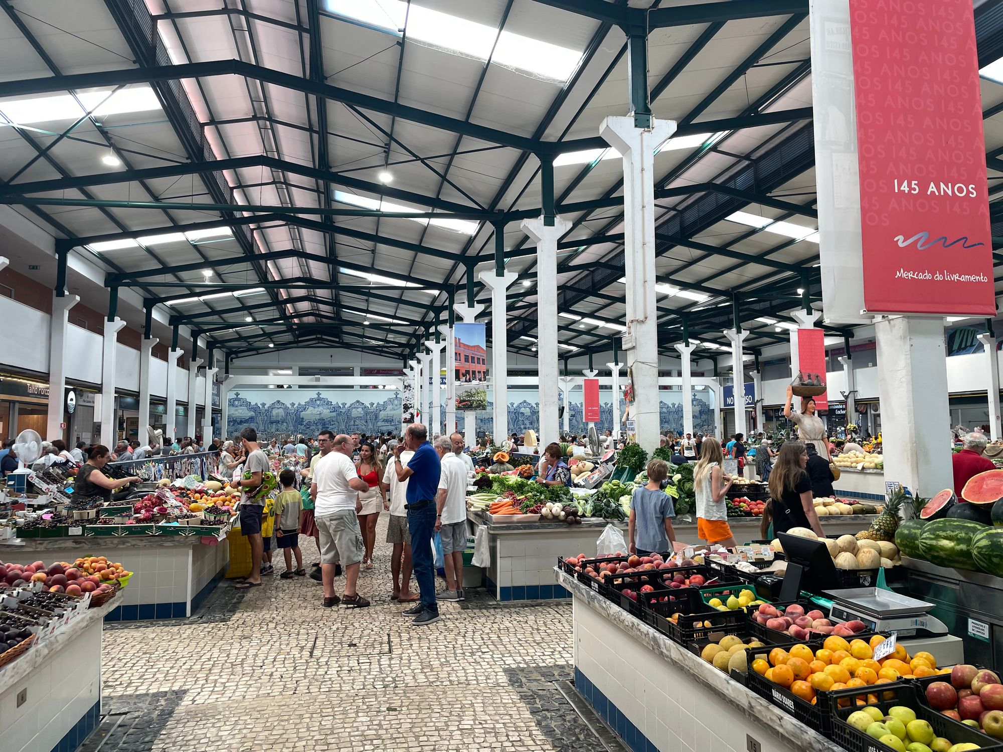 Setubal is renowned for its seafood. Grilled sardines and Choco Frito (fried cuttlefish) are available in many of the restaurants and fishing in general dominates the culture of the area. Additionally the Mercado do Livramento on the famous Av de Louisa Todi is reportedly the largest indoor market in the country and boasts some of the best seafood in the world. It's a 7ish minute walk from our apartment and does not disappoint. Here you will find tuna, salmon, sea bass, bacalhau, sardines, grouper, mackerel sword and scabbard fish, and many, many more varieties. There are also butcher shops, wine stores, cheese makers, farm produce stands, and olives, so many olives. This week Steve came home with potatoes, olives, cherries, and a bottle of piri-piri (hot sauce) made in central Portugal.